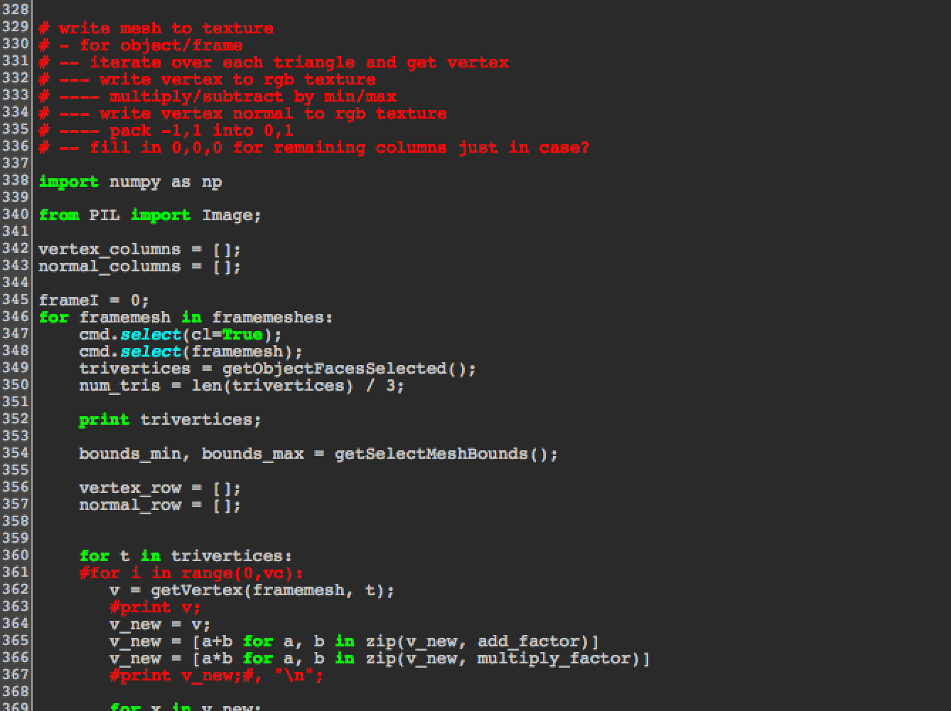 Pipeline to bake vertex animation into a texture file. Highly efficent rendering for certain types of animation. Working in Unity and SceneKit, and applies to any engine.